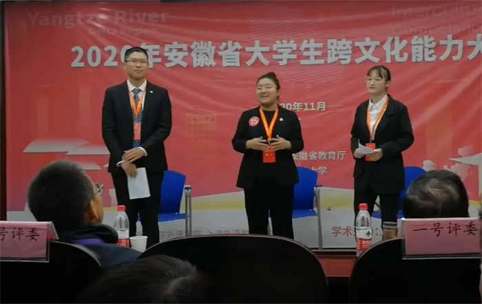 11月21日至22日,由省教育厅主办的2020年安徽省大学生跨文化能力大赛在安徽大学举行。经过两天紧张激烈的角逐,我校代表队荣获本次赛事三等奖。这也是我校学子在“外研社·国才杯”全国英语演讲、写作、阅读大赛复赛(安徽赛区)收获5个奖项后,再次斩获省级奖项。