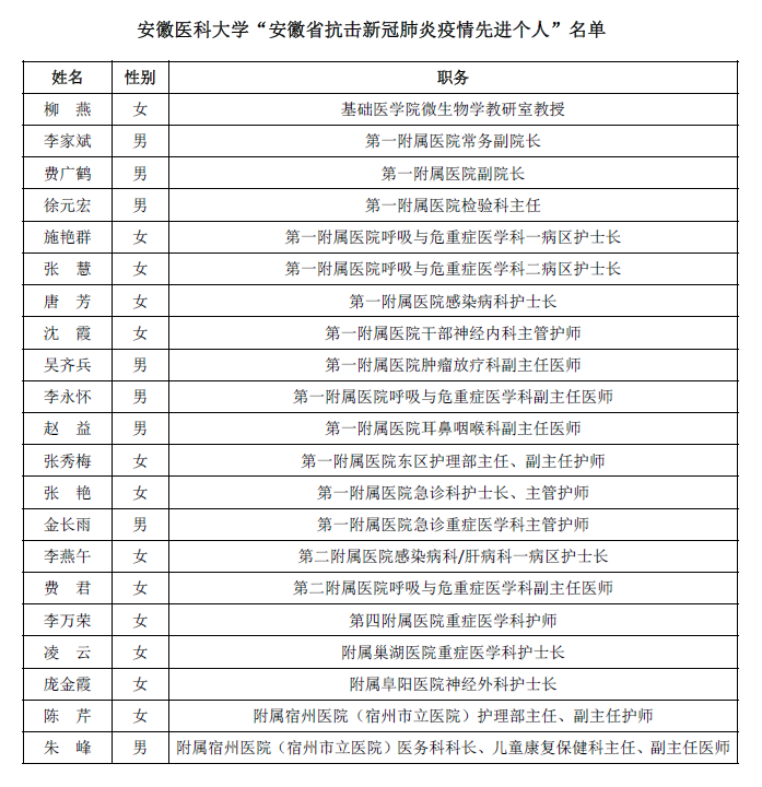 12月7日上午,安徽省抗击新冠肺炎疫情表彰大会在合肥隆重举行,省委书记李锦斌等省领导为受表彰的先进个人代表和先进集体代表颁奖。我校共8个集体、21位教职医护员工获先进表彰。
