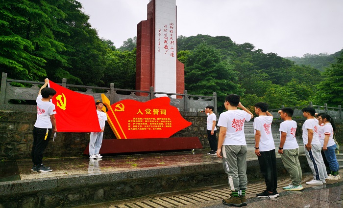 实践团在镌刻着“向牺牲在大别山区的烈士们致敬”的纪念碑前默哀致敬,在鲜红的党旗前庄严宣誓,坚定的誓言声在山林间回荡。“不忘先辈功勋,永远坚定向党,伟大革命斗争精神将激励我们走好新时代长征路上的每一步。”实践团在留言簿上写道。
