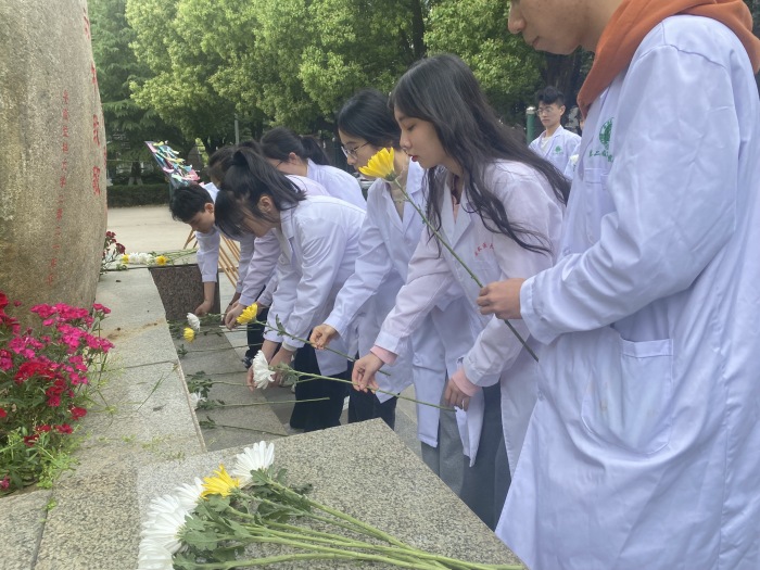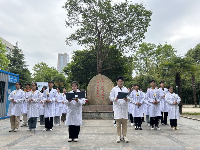 活动中,师生们身着白色实验服、手持金黄色菊花,依次整齐地站立在实验动物纪念碑前默哀鞠躬,并将手中的鲜花轻轻地放在碑前,以此表达对实验动物的尊重,感恩实验动物为生命科学发展做出的贡献。全体学子宣读了医学生誓言并签名,郑重承诺将“忠于医疗教育事业,科学、人道地开展动物实验,严格遵守3R原则”。临床医学专业的陈茜、祝焕同学饱含深情地朗诵了《生命的火花》,一字一句,庄严肃穆,赞扬为人类科学研究作出贡献的无名英雄。