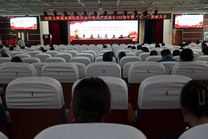 6月28日下午,附属巢湖医院在综合服务楼六楼报告厅举行庆祝中国共产党成立102周年暨“七一”表彰大会。该院党委书记刘颀出席会议并讲话,院党委副书记、院长主持会议,院领导葛丽丹、王陶、刘寰忠、汪卫东、孙会芹等参加会议。