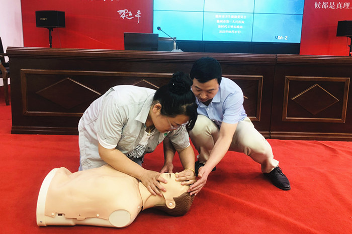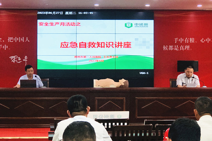 6月27日,附属滁州医院组织医护人员走进中央储备粮滁州直属库有限公司,开展员工急救知识现场培训活动,提高全体人员的公共安全意识。