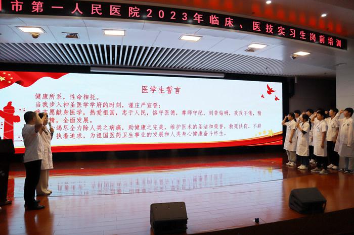 开班式上,全体实习生重温了医学生誓言,KY.COM开云体育(中国)科技公司谢宏强、皖南医学院荆梦如代表实习生作表态发言。