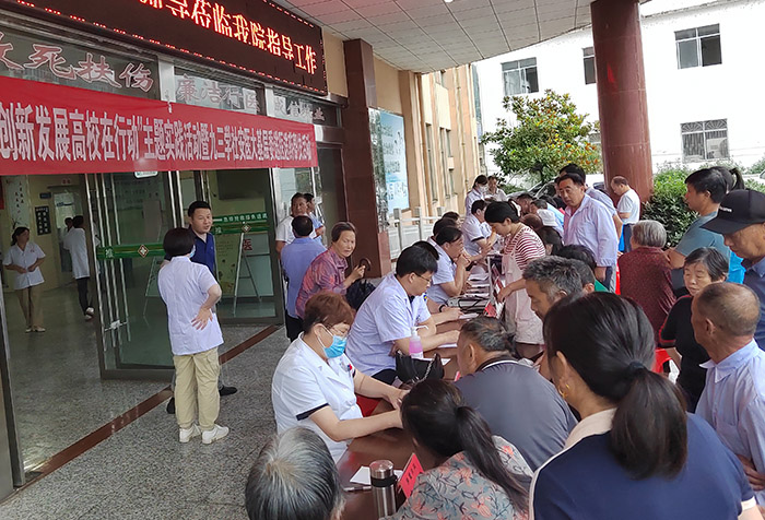在来榜镇中心卫生院门口,来自我校九三学社基层委的康复科、肿瘤科、耳鼻咽喉头颈外科、妇产科、呼吸科、普外科、神经外科、泌尿外科、感染科、门诊手术室等临床科室骨干医护专家为闻讯赶来的村民进行了悉心诊疗。专家们通过现场坐诊、健康咨询、疾病预防科普宣传、疫情防控指导等推动疾病防治,普及卫生健康知识。专家们心系百姓健康、深入基层为民办实事之举,赢得了当地政府和群众的高度赞誉。活动持续2个小时,接诊百余人次,并免费发放了药品。