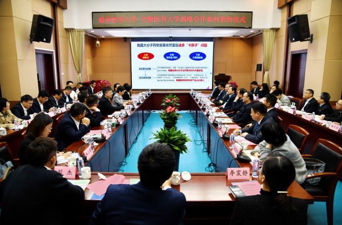 王琦对李校堃院士一行的到来表示热烈的欢迎,向省卫健委、省科技厅、省教育厅长期以来给予学校建设发展的关心支持表示衷心感谢。他表示,此次两校秉持优势互补、互利共赢原则,协商共建大分子药物与规模化制备全国重点实验室合肥中心并达成战略合作意向,既是贯彻落实习近平总书记考察安徽重要讲话精神的具体行动,也是坚持“四个面向”战略方向,推动医学科技事业高质量发展的必然要求,更是深入贯彻“健康中国”和“长三角一体化”国家战略,更好推进长三角卫生健康事业高质量发展的重要举措。