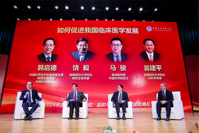 典礼上,韩启德主持以“如何促进我国临床医学发展”为主题的专家对话,翁建平作为对话嘉宾,与其他两位专家就我国临床医学的发展现状、面临挑战以及改进措施等议题进行了深入探讨和交流。
