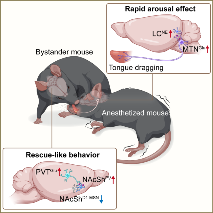 该研究以小鼠为模型,发现旁观者小鼠会对麻醉同伴做出拖拽舌头行为,同时这种舌头上的痛觉刺激能够通过直接的舌—脑神经通路 [舌头→三叉神经中脑核谷氨酸能神经元(MTNGlu)→蓝斑核去甲肾上腺素能神经元(LCNE)] 促进麻醉小鼠的觉醒。此外,团队在研究中还发现,丘脑室旁核(PVT)投射到伏隔核壳(NAcSh)的神经环路调控旁观者小鼠这类特殊的拖拽舌头行为。研究揭示了疼痛刺激对患者苏醒的影响,可能为植物人促醒方面的机理研究带来了新的启示。