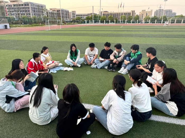 专题分享结束后,学生们来到校园操场,围坐一起,围绕“文学经典作品现代价值思考”“跨学科阅读的多元价值”等话题进行充分交流研讨,气氛热烈活泼。活动负责人2023级生物科学专业王同学表示:“本次读书分享会打破传统的时空局限,我们能够从阅读中不断汲取智慧力量,感悟美好生活,丰富精神世界内涵。“